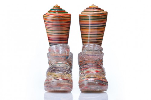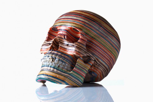 Haroshi creates three-dimensional wooden sculptures with used skateboard decks as his primary medium. He often uses the wheels and other hardware parts as accents, even the grip tape for a sanding tool. He achieves a vibrant striped pattern by stacking the boards with keen attention to the exposed rails (outer edges). After a careful selection process, he stacks decks into layers, cutting them into cubes to form mosaics patterns, assembles them into a desired shape and meticulously carves each form by hand with an uncanny level of skill and precision. Themes in this exhibition include concepts familiar to any skater or artist such as: injury, recovery, obsession, perseverance, healing and growth.