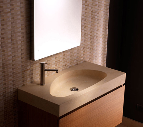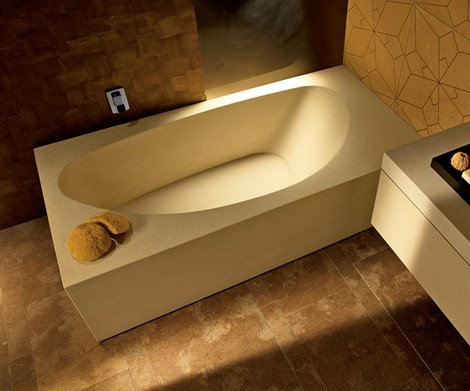 The Gagne solid stone bathtub from I Conci combines both geometrical linearity and sinuous, flowing curves together. The outside of the tub is sharply rectangular, finished in glowing solar yellow. Inside the tub is another matter – the organic shape the company describes as ‘wiggly, wrapping’ is perfect for getting comfortable! A work of art for your daily enjoyment, the Gagne 100% solid stone bathtub is a freestanding piece carved by hand. Stone is a wonderful material for bathtubs – hard-wearing and attractive, stone has an added benefit: heat retention. Unlike cold iron or plastic, the stone will absorb the heat of the water so you can enjoy extra-long baths. A unique solid stone bathtub, the Gagne is from I Conci.